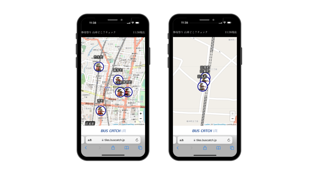 VISH株式会社が提供する「バスキャッチライト」では、山車に設置したスマートフォンから位置情報を発信し、オンラインマップ上で現在地をリアルタイムに表示します。