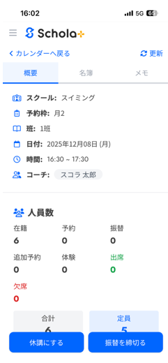 アプリから休講にしたり、振替を締切る操作も可能です。