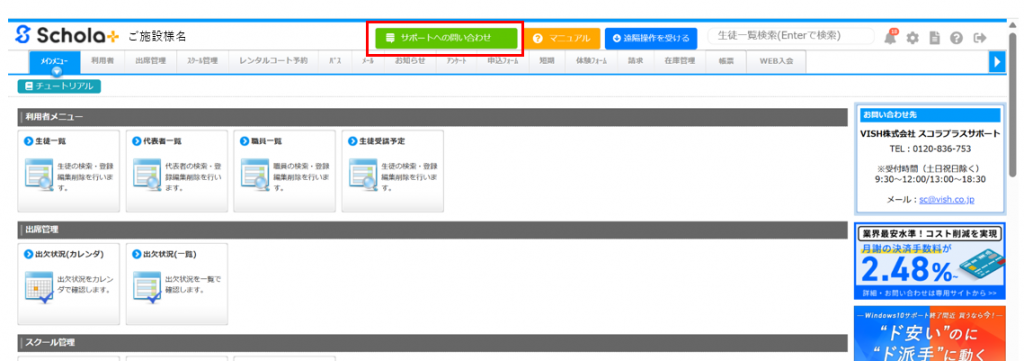スコラプラス管理画面 上部に サポートへの問い合わせ より問い合わせが可能です。