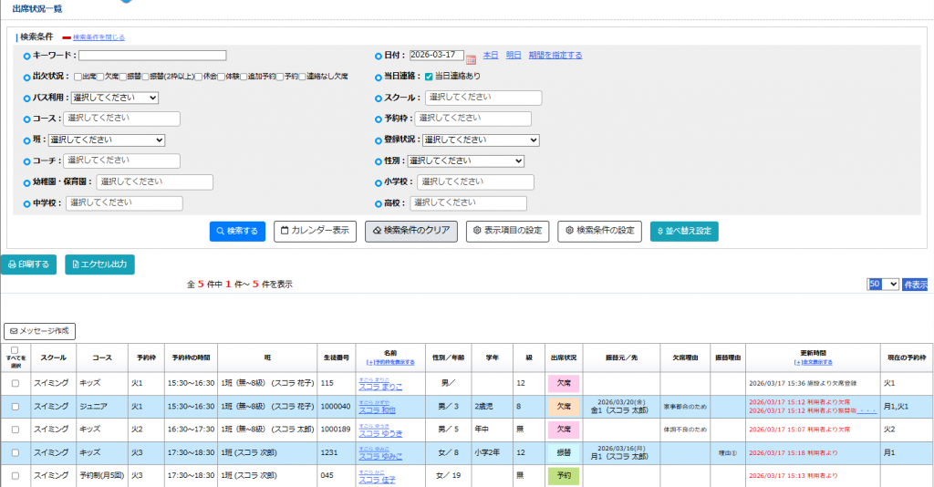 当日操作された 「振替取得」「欠席登録」「予約取得」 が表示されます。